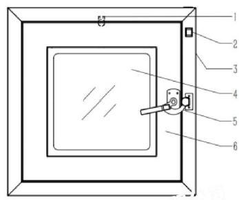 1. Germicidal lamp 2. Germicidal lamp switch 3. Cabinet 4. Glass window 5. Handle 6. Door body